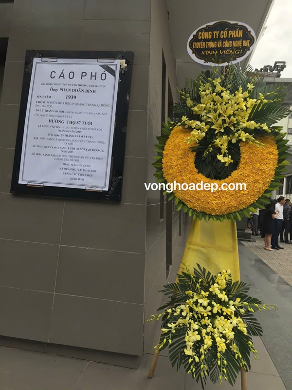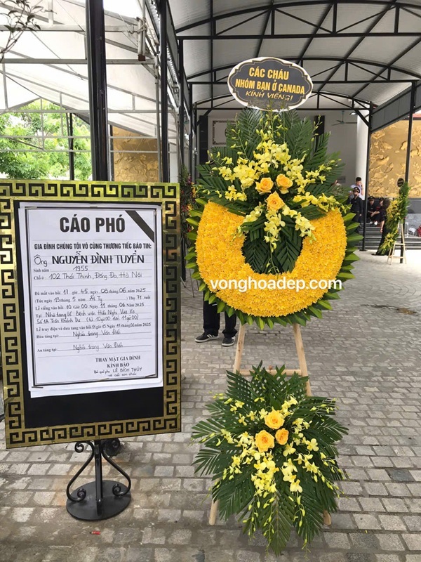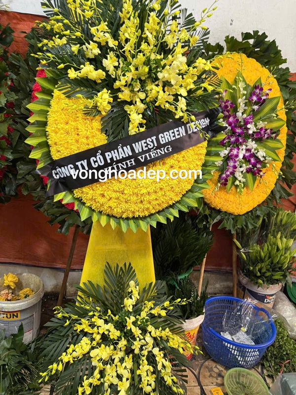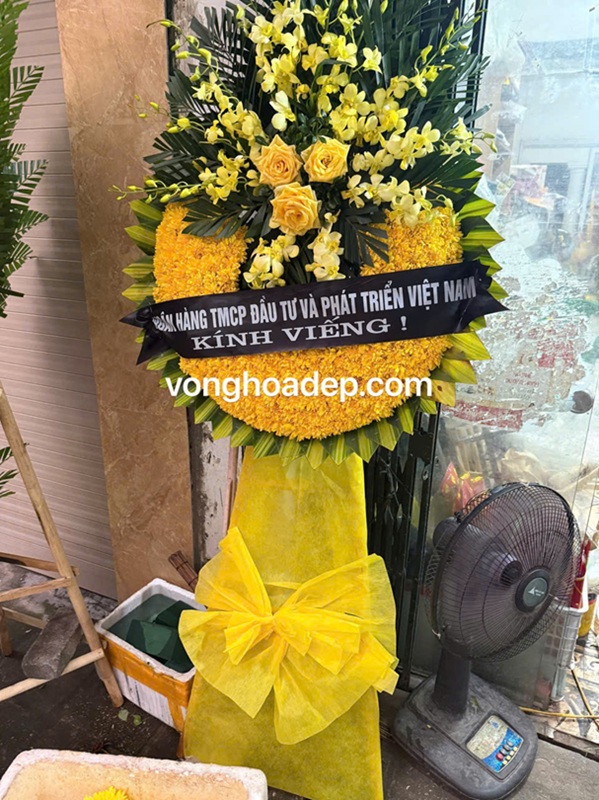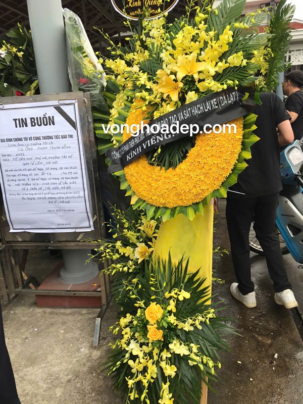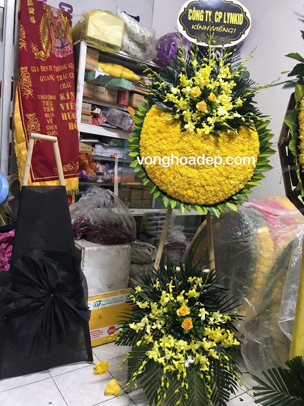 Tùy vào nhu cầu, vòng hoa cúc vàng có thể được thiết kế một tầng, hai tầng hoặc ba tầng, kết hợp thêm lan vàng, ly vàng hay hồng vàng để tăng vẻ trang trọng. Giá thành thường dao động từ 1.000.000 – 1.300.000đ, phù hợp cho cả cá nhân và tổ chức khi gửi lời chia buồn đến tang gia.