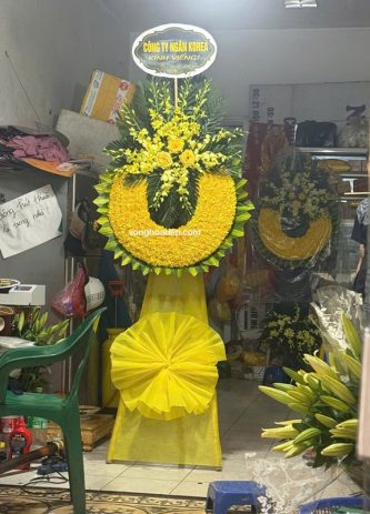 Vòng hoa tang lễ cúc vàng mang vẻ đẹp giản dị nhưng đầy ý nghĩa, tượng trưng cho sự thanh cao, lòng hiếu nghĩa và nỗi tiếc thương sâu lắng. Những cánh cúc vàng được cắm khéo léo thành hình tròn hoặc oval, biểu trưng cho vòng luân hồi – sự tiếp nối của kiếp người. Xen kẽ giữa hoa là lá thiết mộc lan, lá cau được sắp xếp hài hòa, tạo nên tổng thể cân đối và trang nghiêm.