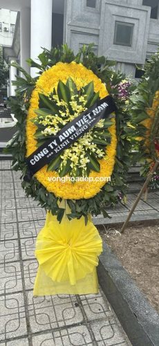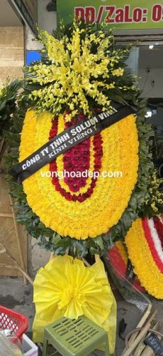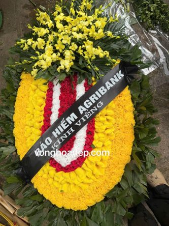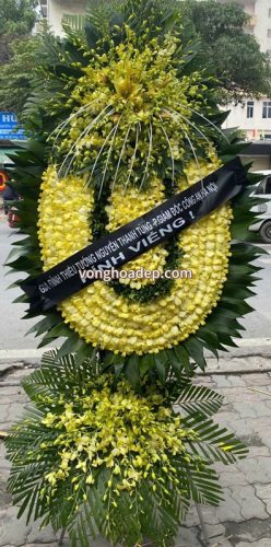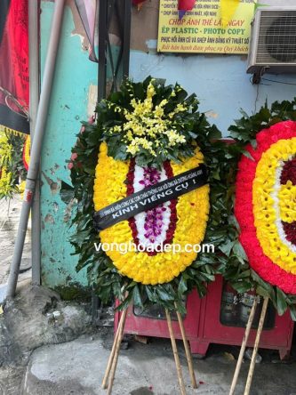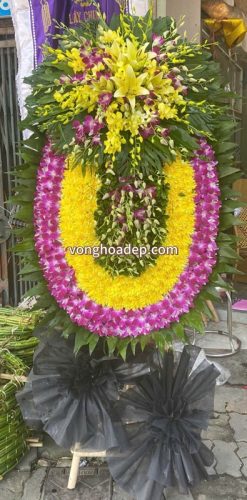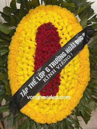 Vòng hoa truyền thống thường được thiết kế dạng oval, kết hợp giữa hoa lan vàng, hoa cúc vàng, hoa lan tím, hoa vàng anh… tượng trưng cho sự thuần khiết, an lành và tưởng nhớ. Tông màu chủ đạo là vàng – đỏ, tạo nên vẻ trang nhã, trang trọng và phù hợp với mọi không gian tang lễ.