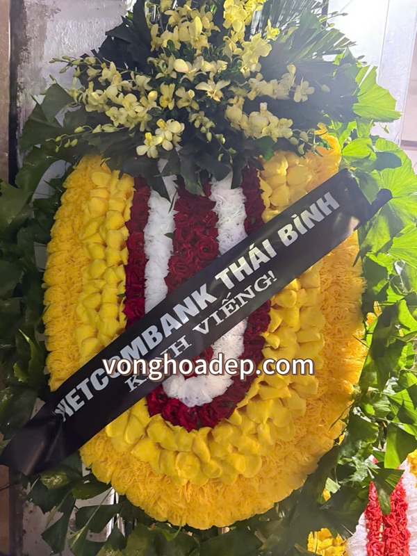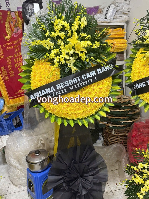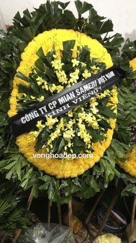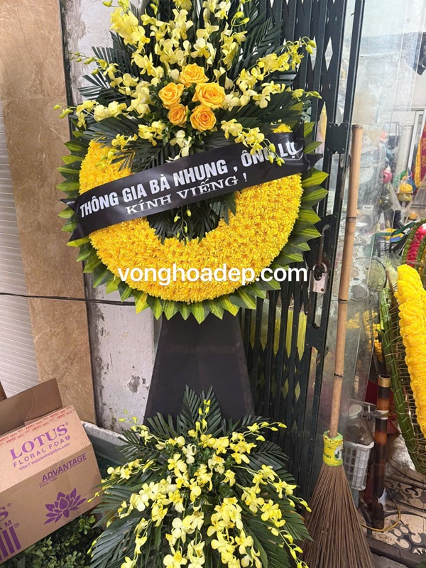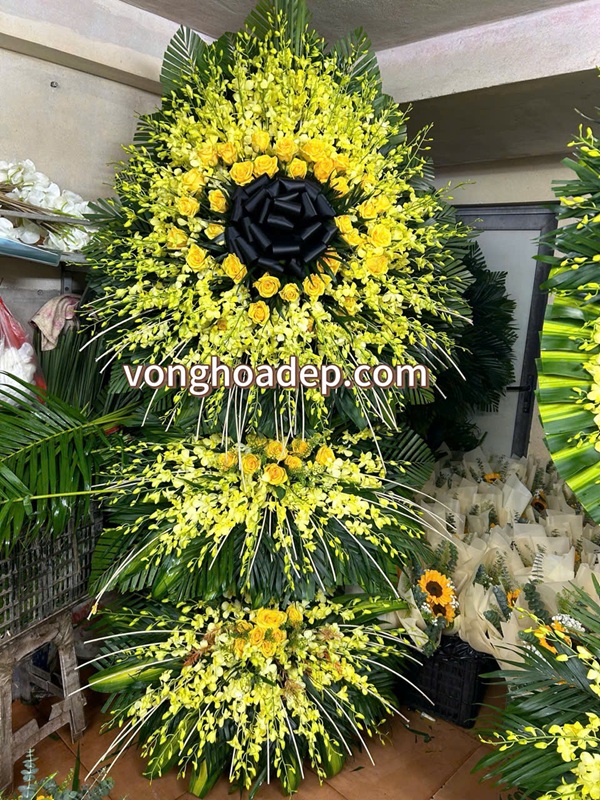 Vòng hoa viếng người già thường mang màu vàng tượng trưng cho sự cao quý và ấm áp. Hoa được cắm tinh tế, hài hòa từ hoa lan vàng, hoa hồng vàng, hoa cúc vàng, kết hợp cùng lá xanh tự nhiên tạo nên tổng thể trang nghiêm, giản dị mà đầy ý nghĩa.